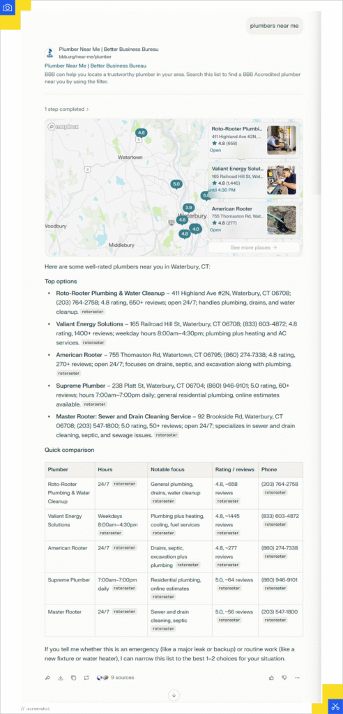 The visual layout varies depending on which model you’re using. While traditional Google Maps displays a broad grid of pins, AI platforms prioritize curated intent, as seen in this example of searching for “plumbers near me.”