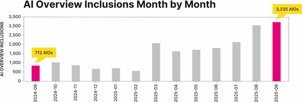 This combination of technical SEO and AI-native content structuring enabled the client’s pages to be consistently selected for AI Overviews, compounding visibility over time.