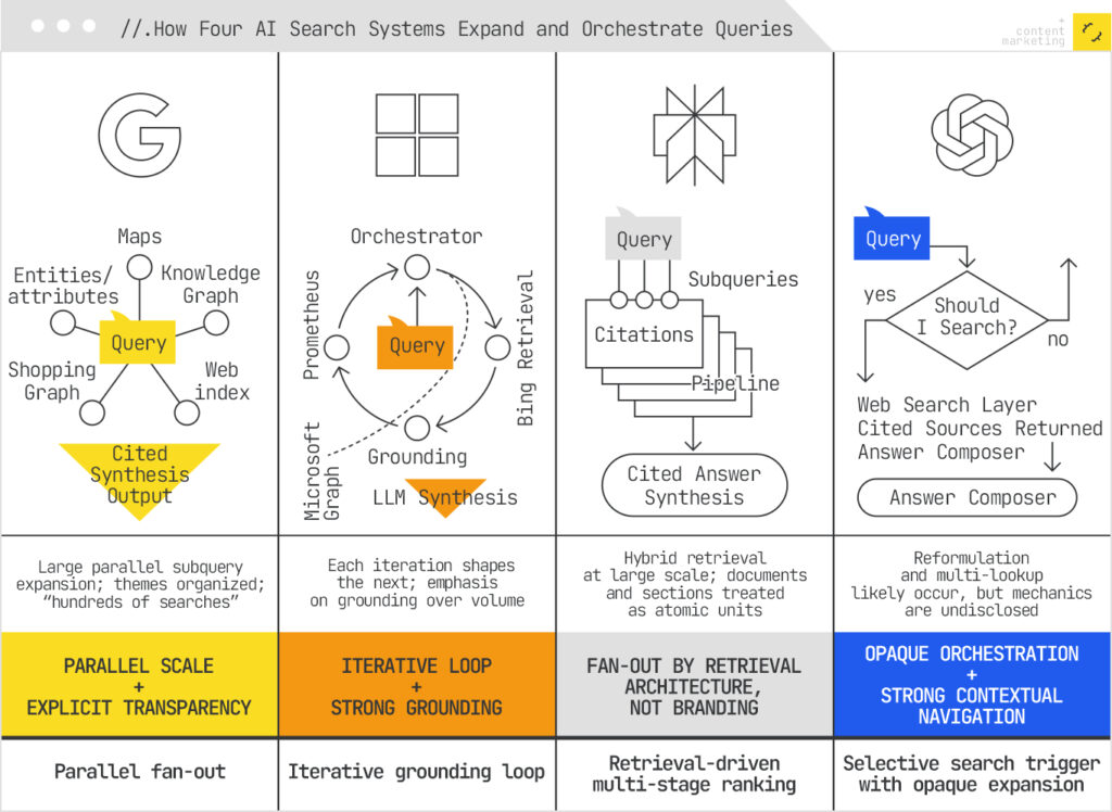 For SEOs and content strategists, this matters because it means your content needs to be discoverable not just by the literal query but by the constellation of related, themed, and contextual subqueries that any of these systems might generate. The specific platform differences are less important than understanding that decomposition itself is the game.