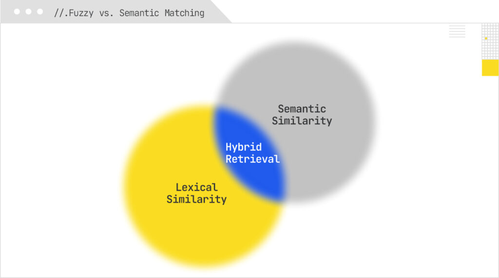 - The system implements lexical fuzzy search: Some hybrid systems continue to incorporate edit-distance, n-grams, or phonetic matching in candidate retrieval to tolerate typos, OCR noise, or format errors.