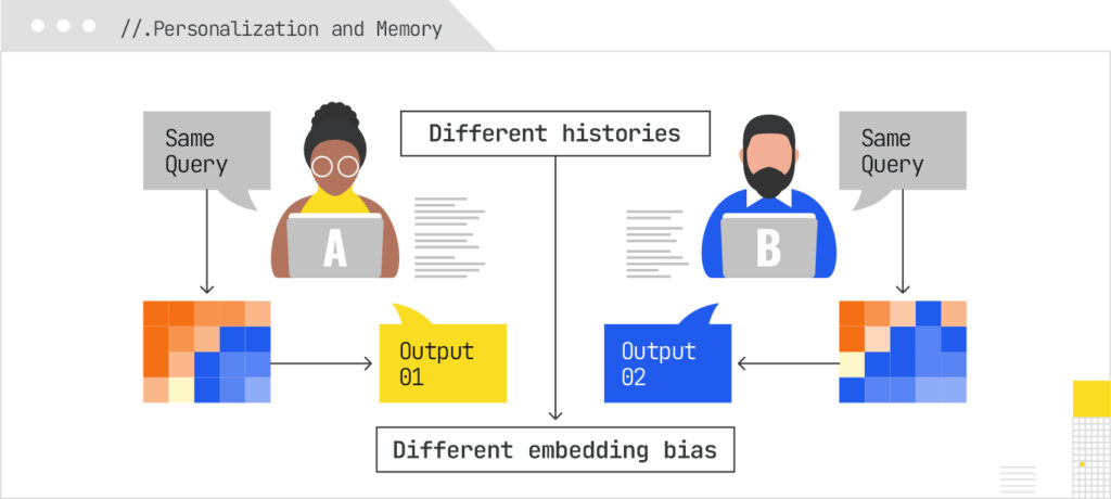 Personalization in LLM-based systems often occurs via user embeddings and memory. In AI Mode, the user’s past queries, preferences, and behavior are embedded and influence which retrieved documents are preferred or how results are weighted. For example, systems may be biased toward content that aligns with the user’s embedding. Note that this is not very different from how traditional search engines utilize individual user context as a preference layer based on past content types that the user engaged with. When in chat-mode, AI search can also incorporate memory or prior dialog context (context memory), so the same query by different users might produce different responses despite the core search intent and question asked being identical.