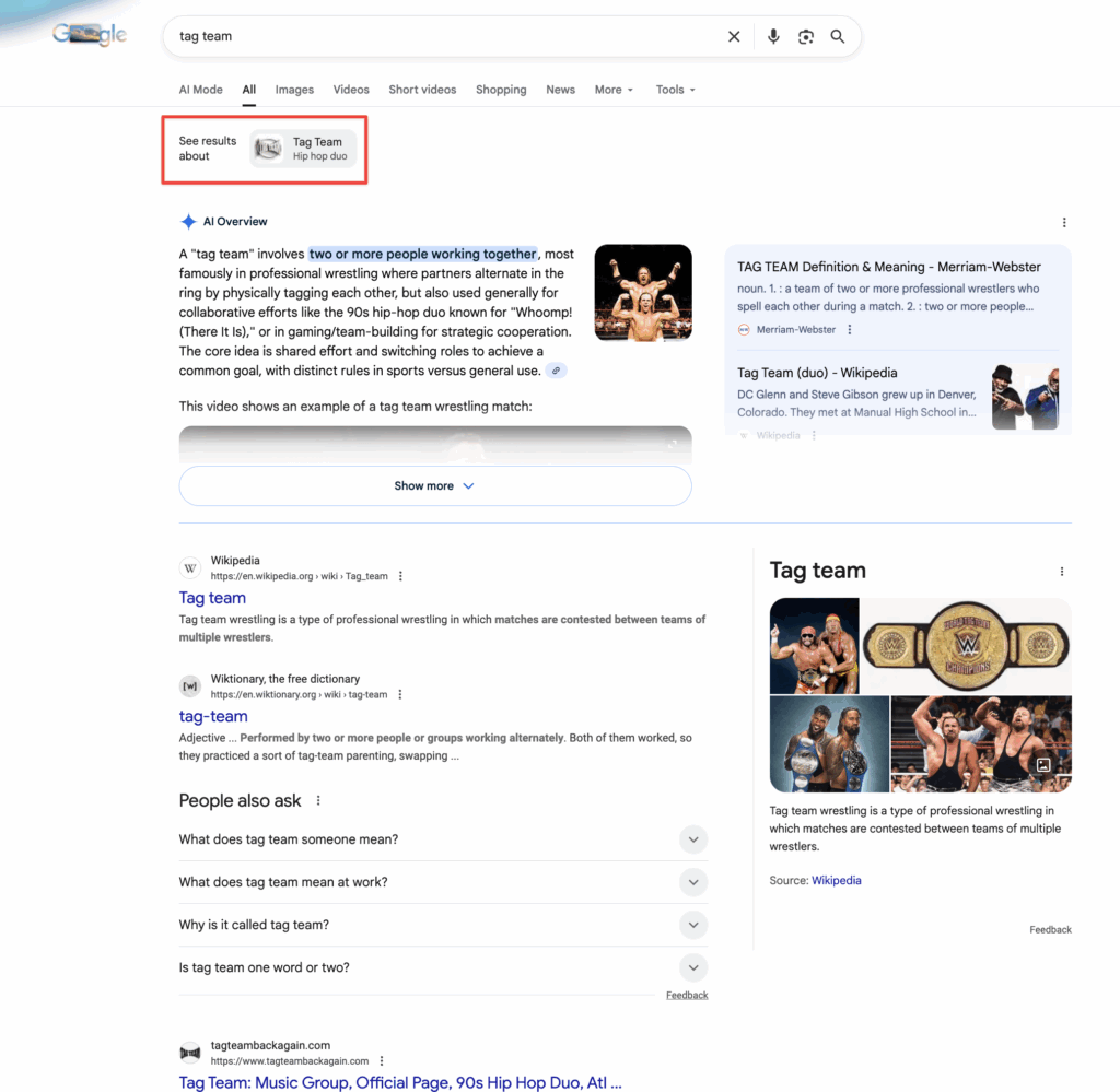 As a cautionary tale, take the 90s Hip Hop Group Tag Team. Founding member DC Glenn has been obsessed with SEO, structured data, and entities for years now. He’s been on a mission to make his group appear whenever you search ‘Tag Team’ on Google. He’s fought to disambiguate the term from the meaning of tag team in wrestling. He joined our Rankable podcast last year and spoke at length about using structured data to grow the authority of his entity: