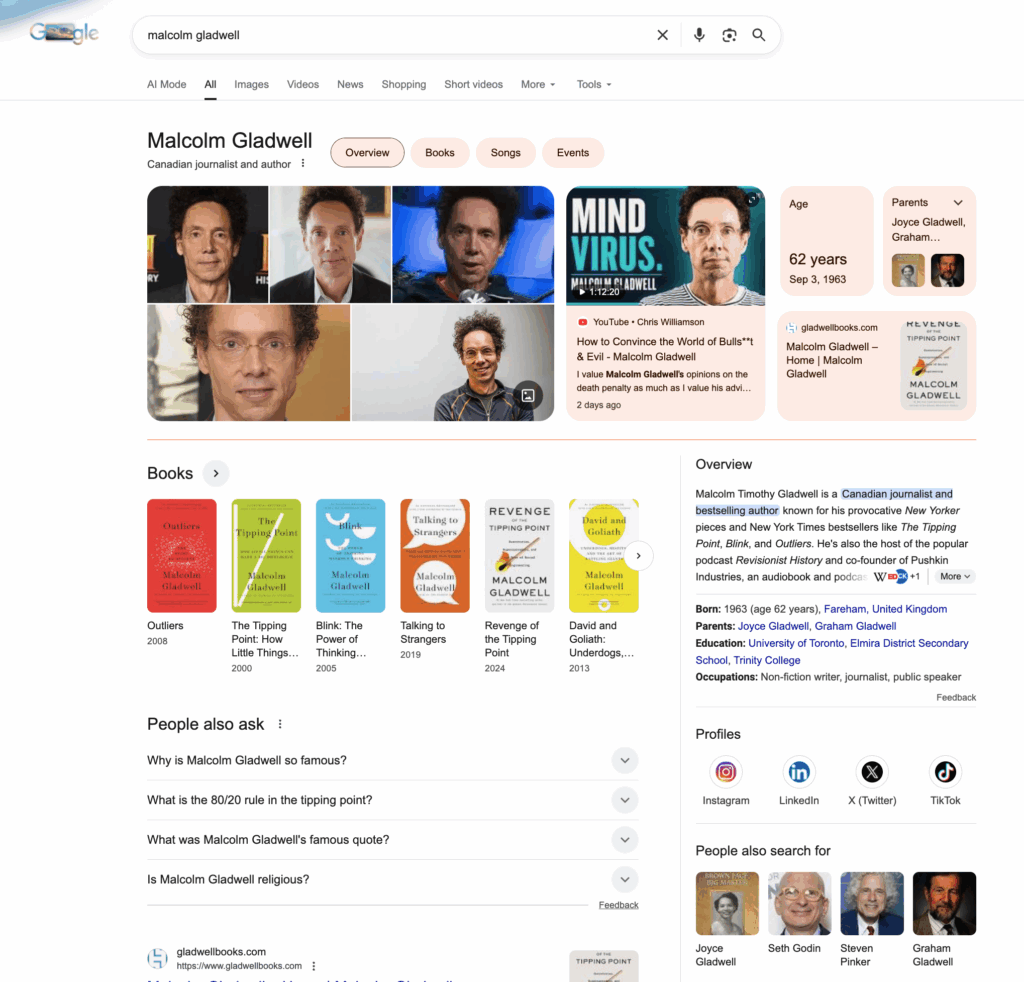 If you’re familiar with Gladwell, you already know this. What’s so important about these facts? Well, they’re all entities that are directly associated with Gladwell.